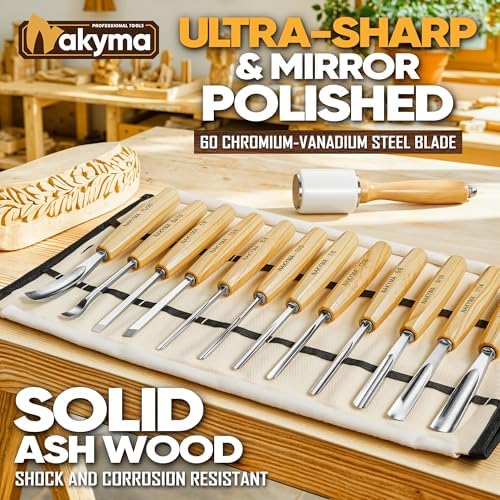 Wood Carving Kit, 12 PCS Wood Carving Set – Wood Carving Tools with Canvas Case,Sharp Cr-V 60 Steel Blades, Wood Chisel Sets for Beginners and Professionals